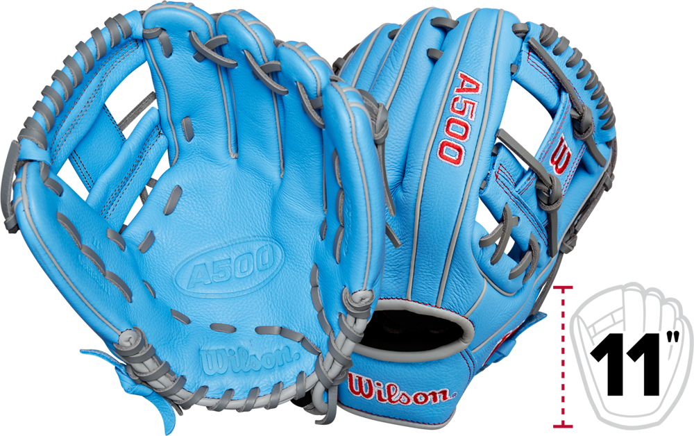 Mit der A500-Serie stellt Wilson die leichtesten Vollleder Gloves auf dem Markt vor. Dass dabei die Ausstattung nicht zu kurz kommen muss, beweisen Features wie das Dual Welting (zwei Nähte auf der Außenseite der Fingersegmente) und das Double Palm (zusätzlich aufgenähtes Lederstück in der Handinnenfläche), die die Formgebung und den Formerhalt verbessern. Dank der Vorölung sind die A500 Gloves quasi aus dem Regal spielbereit. Der A500 WBW10253811 ist mit seiner 11“ Länge der perfekte Glove für den Nachwuchsspieler. Das Quick-Fit Wrist System (ein elastischer Gummizug bringt die Handöffnung automatisch auf die passende Größe) und ein flexibles H-Web erleichtern dabei vor allem den Youngstern den Einstieg.
