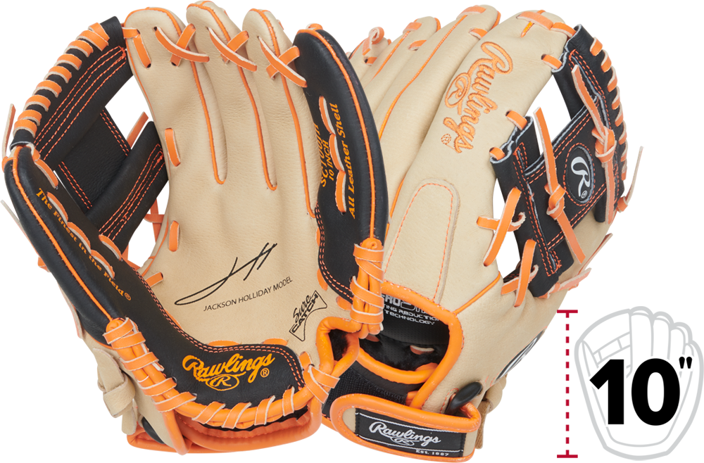 Tolle Handschuhe für die jungen Einsteiger bietet Rawlings mit der Sure Catch Serie. Neben einer Volllederausstattung bieten die Gloves weitere Features, die dem Nachwuchs den Einstieg erleichtern. Dazu gehört eine „sure catch“-Kerbe in der Wangenpolsterung, die das Schließen des Gloves erheblich erleichtert und so die Handschuhkontrolle erhöht. Der halb offene „Neo-Flex“-Back liefert das sichere Gefühl eines closed back mit der Flexibiltät eines offenen Handschuhrückens. Die Handöffnungsgröße kann zusätzlich über einen Klettverschluss variiert werden. Der Rawlings Sure Catch SC100JH kommt im coolen „Jackson Holliday“-Design, bietet eine 10" Handschuhlänge und ein zusätzliches Hand- und Zeigefingerpolster. Die Fangaufgaben übernimmt ein offenes Pro I-Web.