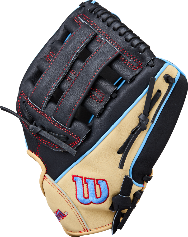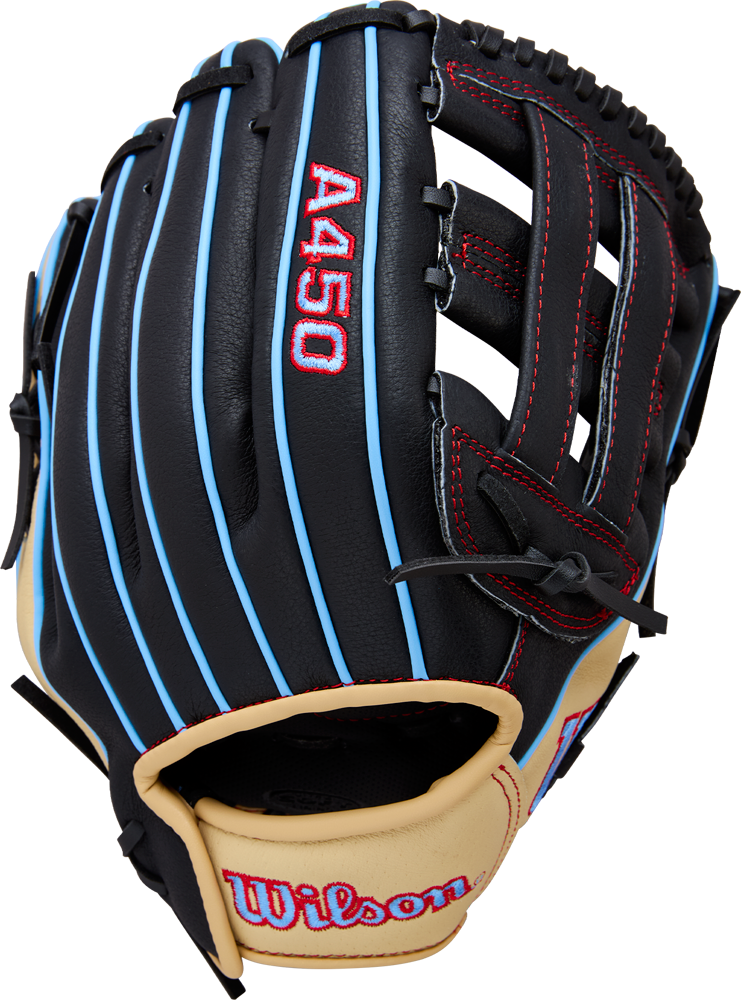 11” long Baseball Glove for the beginning player. A pre-oiled pig skin leather shell reduces break-in. Dual Welting, two seams running the length of each finger slot, increase shape retention. A flexible H-Web takes care of the catching duties while an open back provides maximum range of motion for the hand. The Wilson Quick-Fit system, an elastic band in the back of the Gloves, automatically adjusts the diameter of the hand opening to fit the players hand.